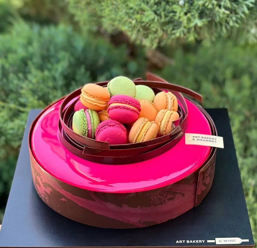 This is one of my most-loved cakes. At its heart is a rich, gluten-free chocolate sponge topped with smooth milk chocolate crémeux, layered with vibrant raspberry confit, all wrapped in a delicate lime mousse. It is finished with a shiny mirror glaze, hand-crafted chocolate décor, and a colorful assortment of macarons.